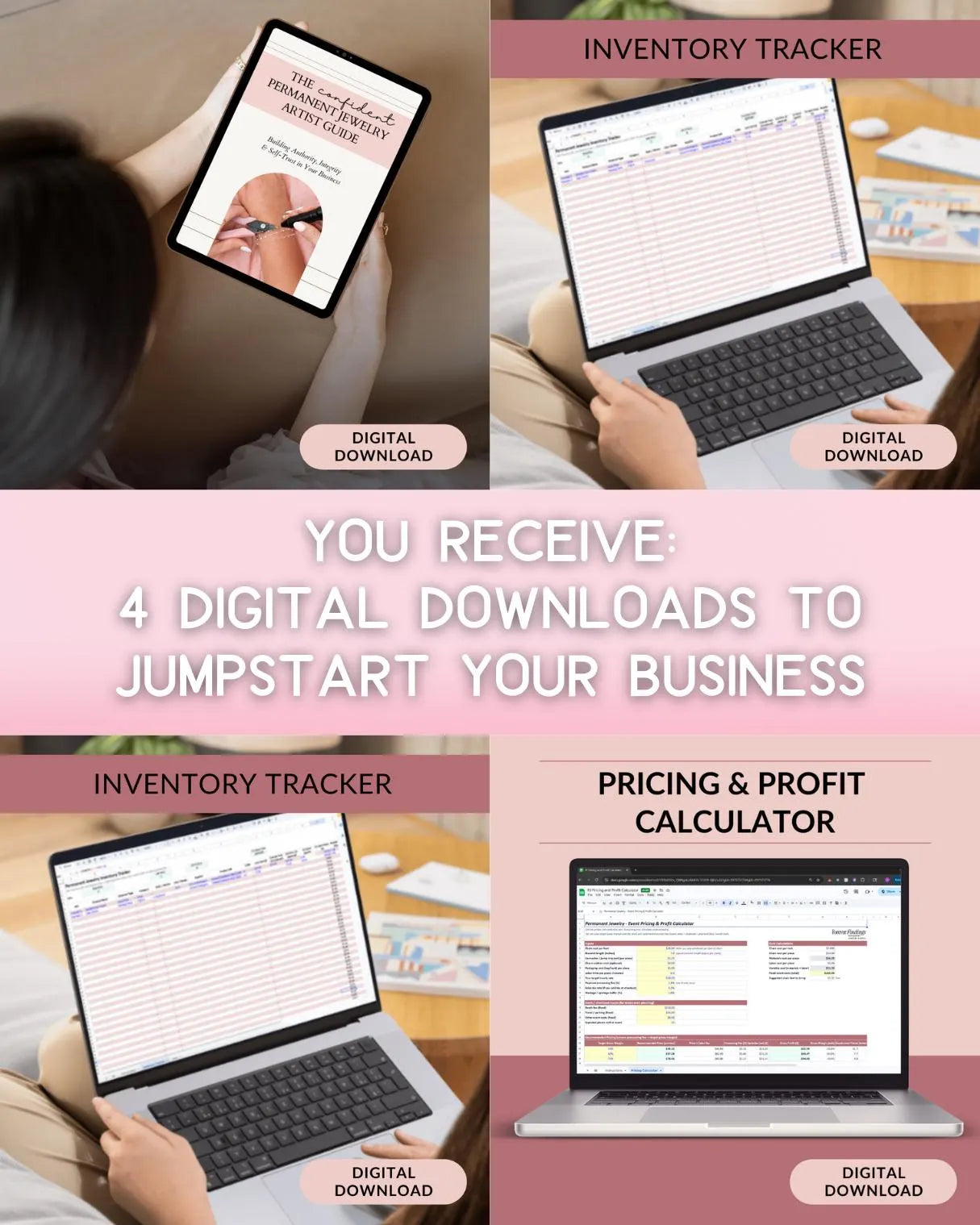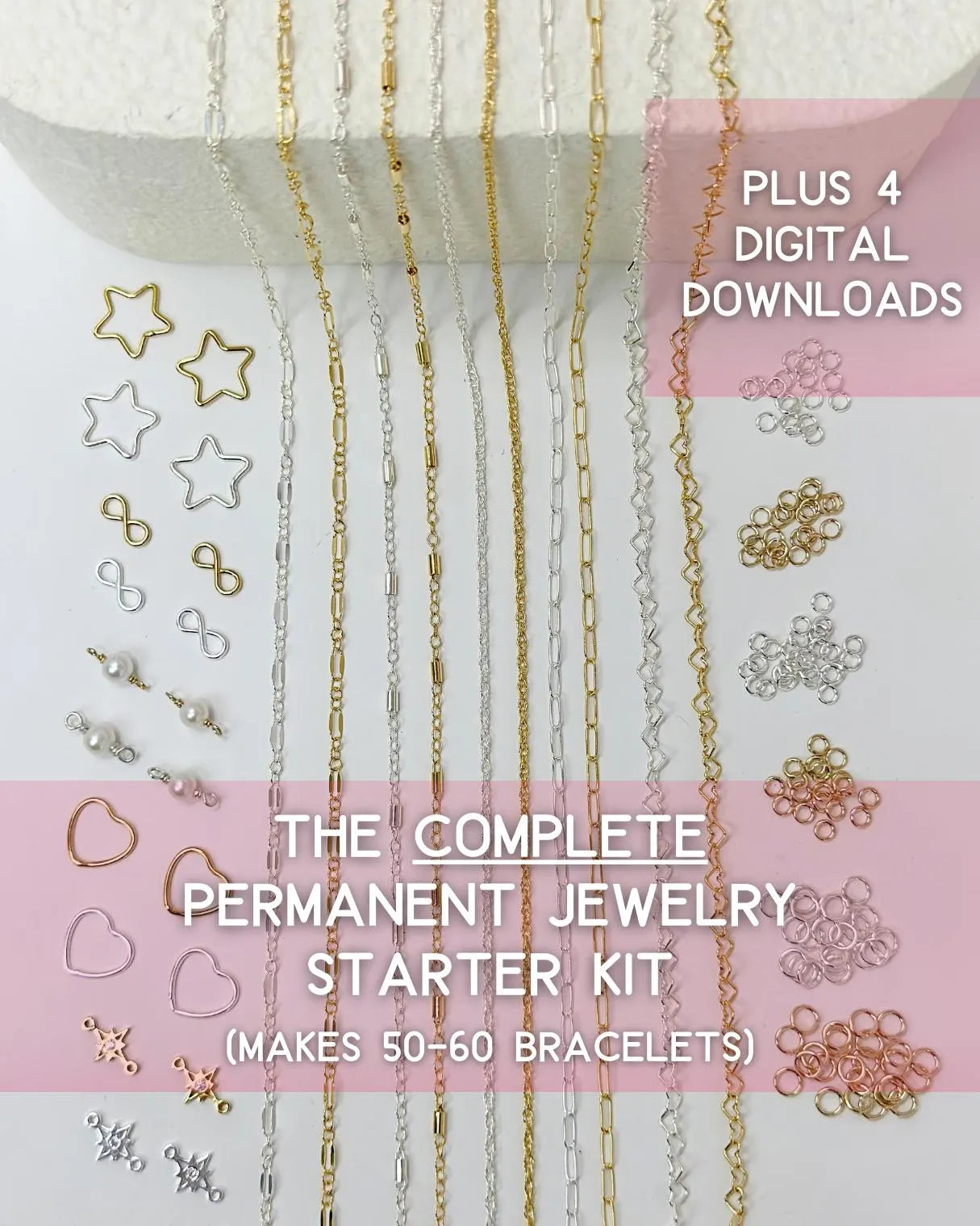 We've curated a set of 10 of our favorite chains, 10 best-selling charms, and 3 sizes of jump rings to start your permanent jewelry business! We've also included 4 digital downloads to jump-start your business. From inventory tracking and pricing to social media and building confidence, these downloads will help you dominate in the industry. With the average bracelet measuring 7 inches, this set should make approximately 50-60 bracelets!
